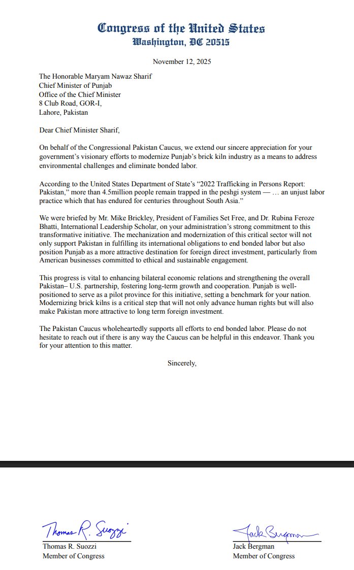 نیو یارک (تھرسڈے ٹائمز) — امریکی کانگریس کے اراکین نے وزیراعلیٰ پنجاب مریم نواز کے نام ایک تفصیلی خط میں پنجاب میں اینٹوں کے بھٹوں کی صنعت کو جدید خطوط پر استوار کرنے کے اقدام کو سراہا ہے، جسے وہ پاکستان میں جبری مشقت کے خاتمے اور ماحول دوست صنعتی پالیسیوں کی جانب ایک اہم پیش رفت قرار دیتے ہیں۔