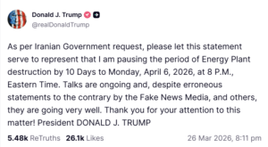 ڈونلڈ ٹرمپ نے مشرقی وقت کے مطابق 6 اپریل 2026 بروز سوموار رات 8 بجے تک کیلئے امریکی حملے ملتوی کرنے کا اعلان کرتے ہوئے لکھا ہے کہ مذاکرات جاری ہیں جو فیک نیوز میڈیا (جعلی خبریں پھیلانے والے ذرائع ابلاغ) اور بعض دیگر حلقوں کے غلط بیانات کے برعکس بہت اچھے انداز میں آگے بڑھ رہے ہیں۔
